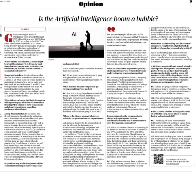 The article examines whether the rapid surge in Artificial Intelligence investment and adoption represents a speculative bubble similar to the dot-com era or the early phase of a transformative technological revolution, through a discussion between Bhagwan Chowdhry and Anoop Kunchukuttan.
