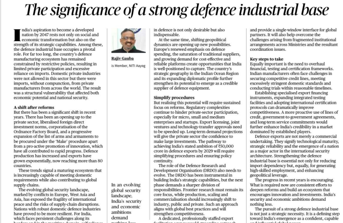 The author discusses why a robust defence industrial base is central to India’s ambition of becoming a developed nation by 2047, highlighting recent reforms, emerging geopolitical opportunities, and the need for deeper structural changes to make India a reliable global defence manufacturer and exporter.