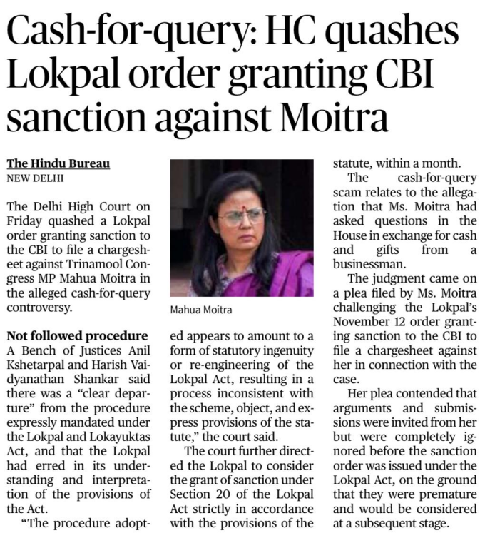| Cash-for-query: HC quashes Lokpal order granting CBI sanction against Moitra | |