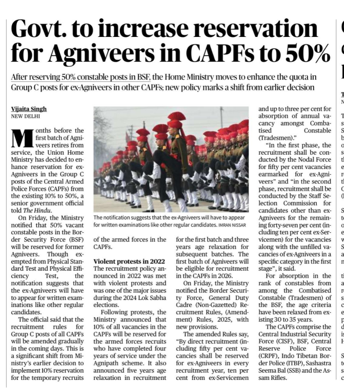 | Govt. to increase reservation for Agniveers in CAPFs to 50% | |