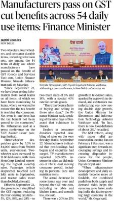 | 5. | Manufacturers pass on GST cut benefits across 54 daily use items: Finance Minister |