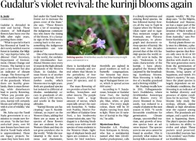 Context: In a remarkable ecological event, the kurinji flowers (Strobilanthes spp.) have bloomed once again in Gudalur, located in the Nilgiris district of Tamil Nadu, after eight years.