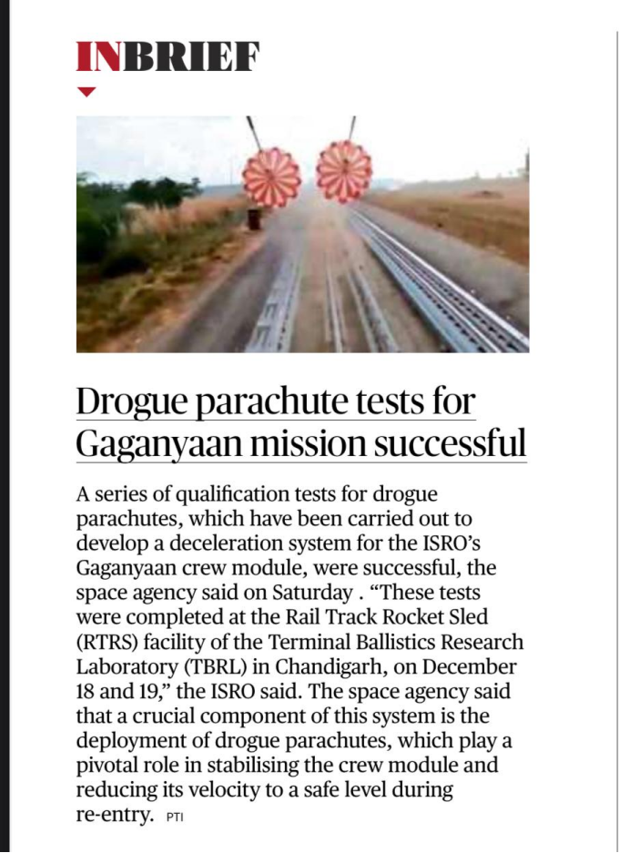 | Drogue parachute tests for Gaganyaan mission successful | |