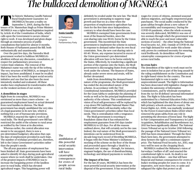 The article critiques recent policy and legislative changes affecting MGNREGA, arguing that these measures dilute its rights-based, demand-driven character and weaken decentralised governance, thereby undermining rural livelihoods and constitutional guarantees.