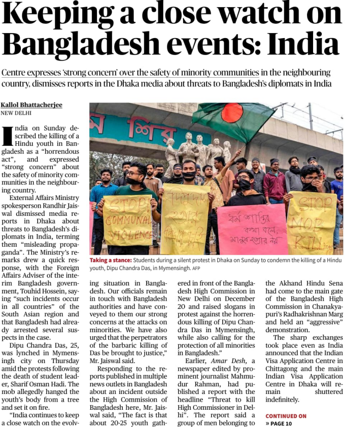 • A Hindu Youth, Dipu Chandra Das, was lynched in Mymensingh, Bangladesh, which India described as a horrendous act.