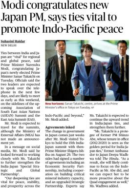 | 6. | Modi congratulates new Japan PM, says ties vital to promote Indo-Pacific peace |
