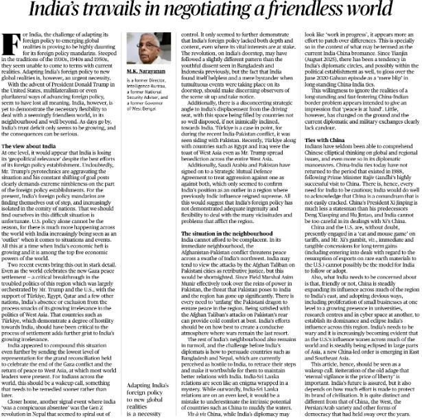 The article, written by M.K. Narayanan (former National Security Adviser and ex-Governor of West Bengal), critically examines the challenges faced by India’s foreign policy in adapting to a rapidly evolving global and regional order. It argues that India’s diplomatic approach—rooted in traditional non-alignment and moral posturing—needs a major recalibration to address the complexities of a “friendless world” dominated by transactional geopolitics, assertive neighbours, and weakening multilateralism.