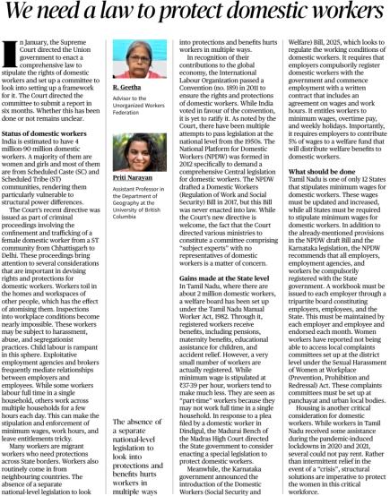 Context In January 2025, the Supreme Court of India directed the Union Government to enact a comprehensive national law protecting the rights of domestic workers and to set up a committee to draft a legal framework. However, the status of this directive remains unclear. The issue highlights a long-standing policy gap — while India depends heavily on domestic workers for household and care work, there is no uniform national legislation to regulate their employment, wages, or working conditions.