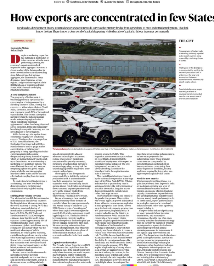 • A small group of States now dominates India’s export basket, masking stagnation in many other regions.