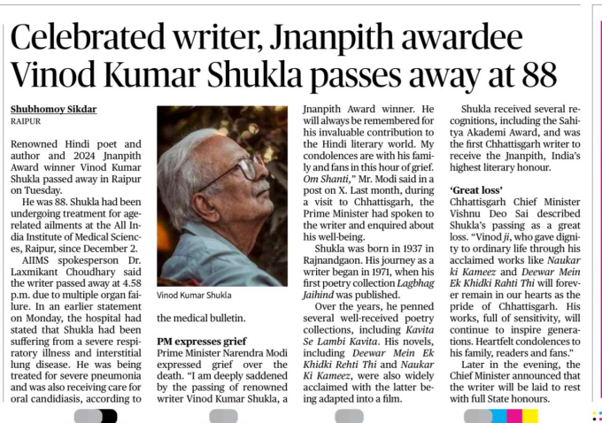 1. Celebrated writer, Jnanpith awardee Vinod Kumar Shukla passes away at 88