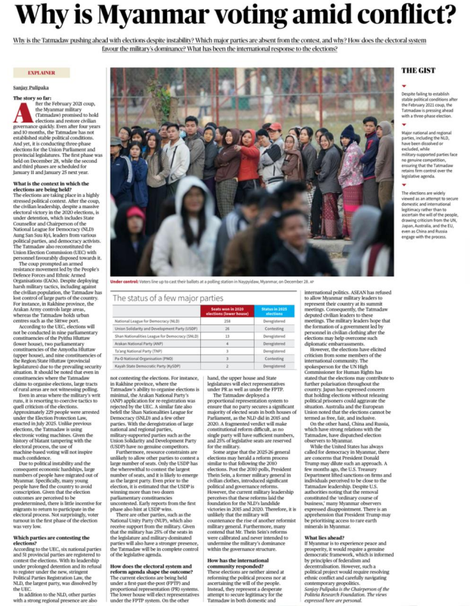 UPSC Mains Question “Elections conducted in conflict zones often fail to ensure democratic legitimacy.” Discuss this statement with reference to the ongoing political situation in Myanmar. Source: The Hindu