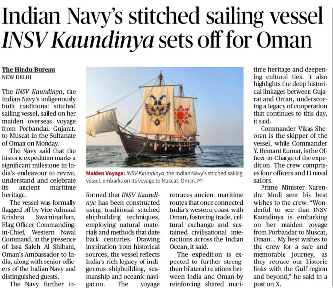 | 3. | Indian Navy’s stitched sailing vessel INSV Kaudinya sets off for Oman |