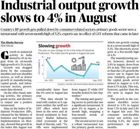 Why in News? - India’s Index of Industrial Production (IIP) growth slowed to 4% in August 2025, compared to 4.3% in July and a sharp fall from previous months.
