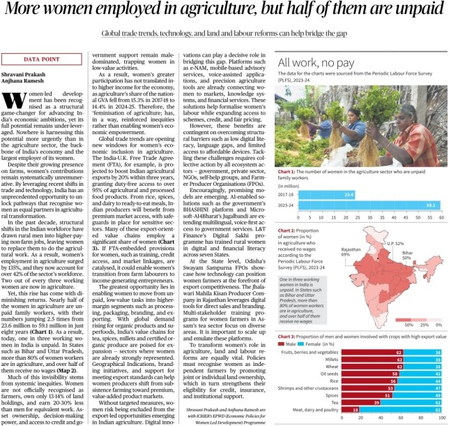 Why in News? - Recent Periodic Labour Force Survey (PLFS) 2023–24 data shows that while more women are engaged in agriculture, nearly 50% of them are unpaid family workers.
