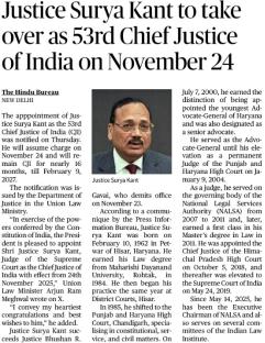 | 6. | Justice Surya Kant to take over as 53rd Chief Justice of India on November 24 | |