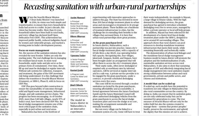 In this article, the authors examine how India’s sanitation journey under the Swachh Bharat Mission (SBM) must evolve beyond toilet construction to address the critical challenge of faecal sludge and septage management (FSSM). They argue that urban–rural partnerships offer a practical and scalable solution to bridge sanitation gaps, especially in peri-urban and rural areas, by leveraging existing urban treatment infrastructure.