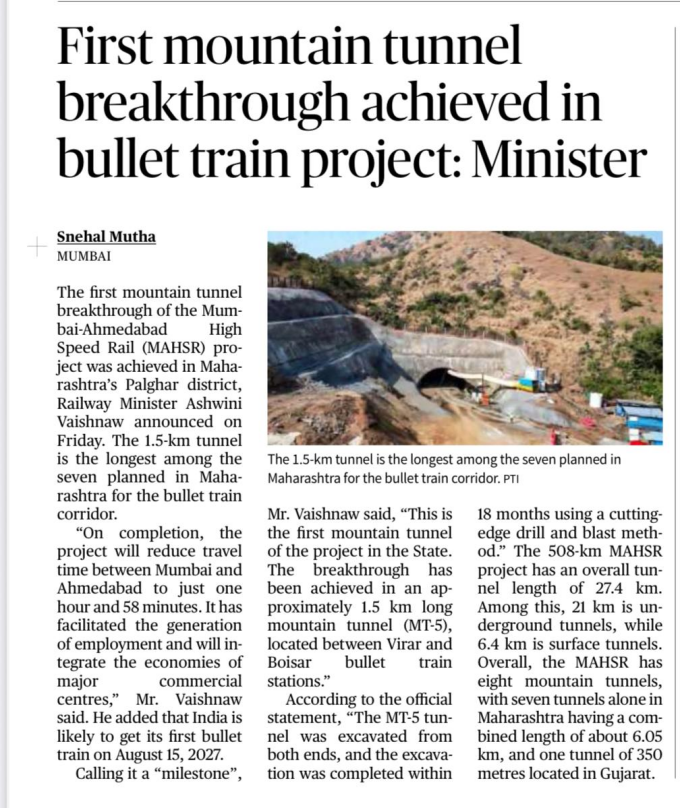 | 7. | First mountain tunnel breakthrough achieved in bullet train project: Minister |