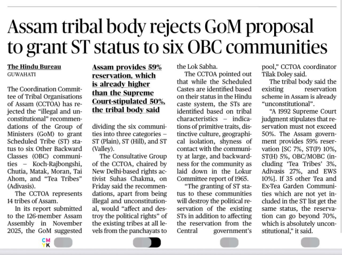 | 5. | Assam tribal body rejects GoM proposal to grant ST status to six OBC communities |