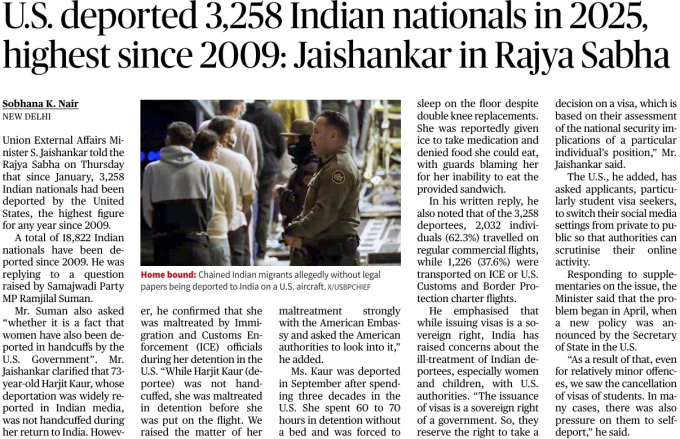 | 7. | U.S. deported 3,258 Indian nationals in 2025, highest since 2009: Jaishankar in Rajya Sabha |
