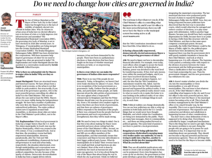 The article is a Parley discussion between Anant Maringanti and T.R. Raghunandan on whether India needs to fundamentally change how its cities are governed. It examines the weak role of elected Mayors, the dominance of Chief Ministers and State bureaucracy, and the limited impact of the 74th Constitutional Amendment on urban self-government.