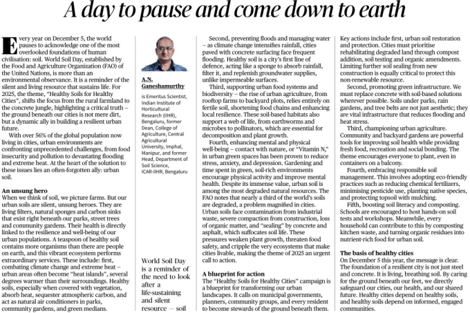 The article highlights the importance of urban soil on World Soil Day (December 5), emphasising its crucial but overlooked role in ensuring food security, climate resilience and healthy urban living, especially under the 2025 theme, “Healthy Soils for Healthy Cities.”