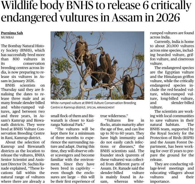 | 4. | Wildlife body BNHS to release 6 critically endangered vultures in Assam in 2026 |