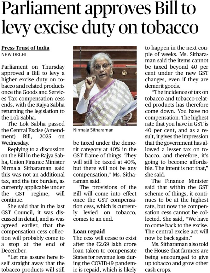 Context Parliament approved the Central Excise (Amendment) Bill, 2025 to allow the Centre to levy higher excise duty on tobacco and related products once the GST compensation cess (currently used to tax tobacco) comes to an end