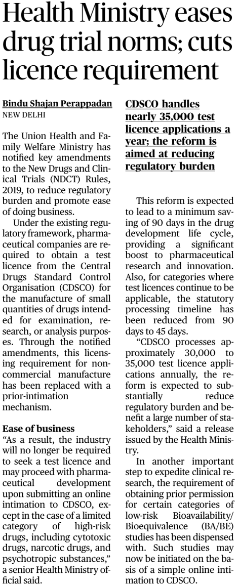 The Union Health and Family Welfare Ministry has notified amendments to the New Drugs and Clinical Trials (NDCT) Rules, 2019 to reduce regulatory burden and promote ease of doing business in pharmaceutical research and development.