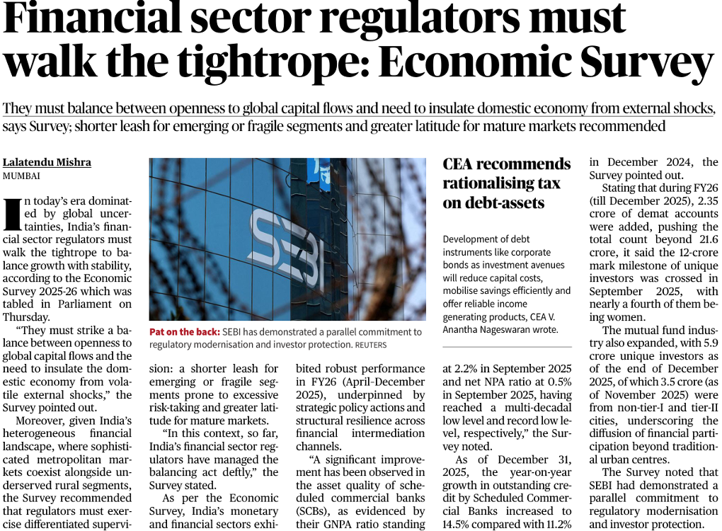 The Economic Survey 2025–26 highlights the need for India’s financial sector regulators to balance openness to global capital flows with safeguarding the domestic economy from external shocks, amid heightened global uncertainty.