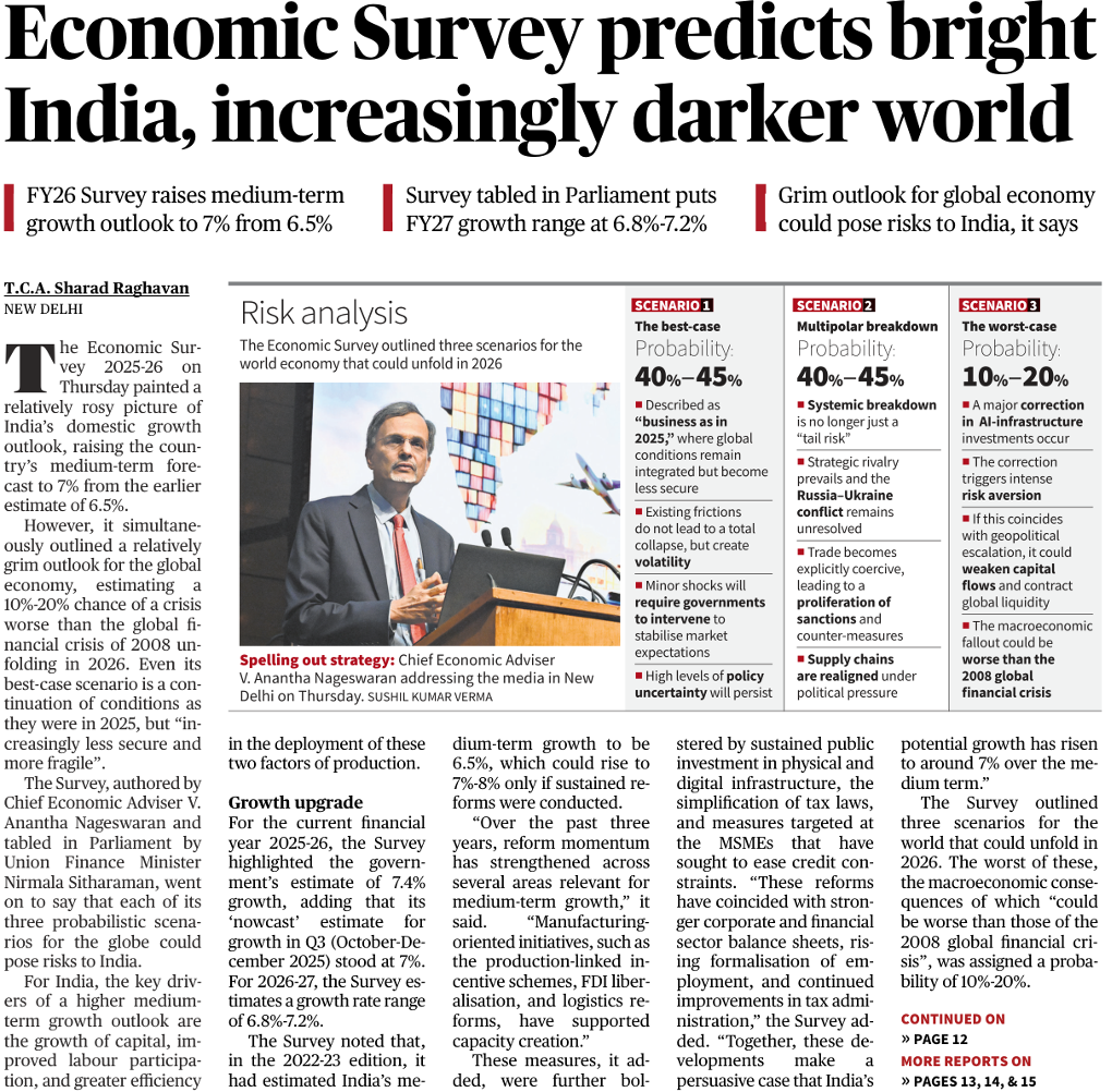 ContextThe Economic Survey 2025–26, tabled in Parliament, projects a strong medium-term growth outlook for India while warning of rising global economic risks and heightened uncertainty in 2026.
