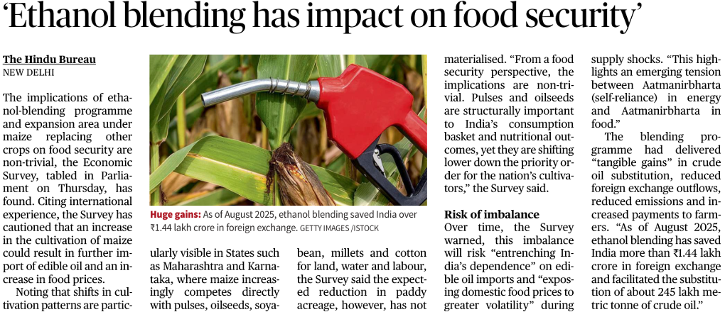 The Economic Survey, tabled in Parliament, has flagged that the expansion of ethanol blending—especially through increased maize cultivation—has non-trivial implications for food security, crop balance, and price stability, even as it delivers energy and forex gains.