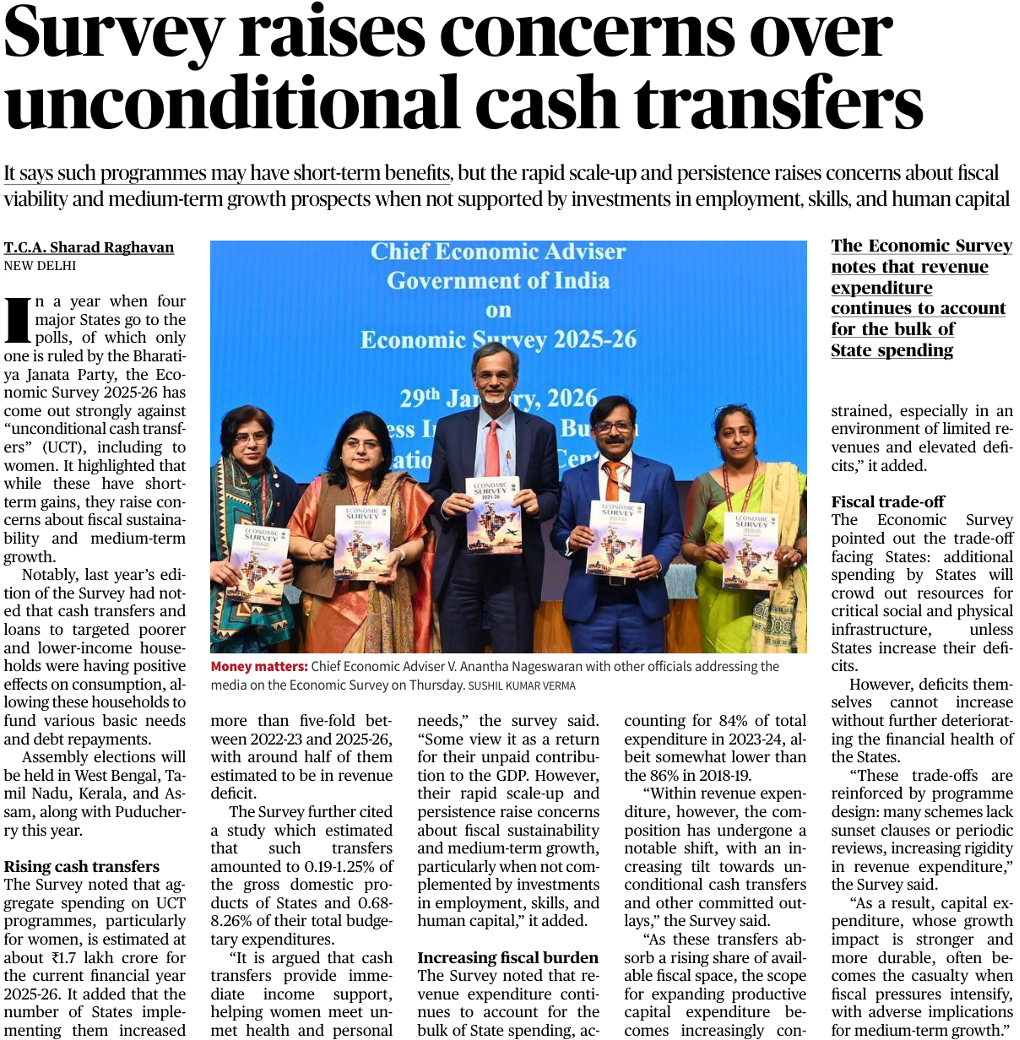 The Economic Survey 2025–26, tabled in Parliament, has flagged concerns over the rapid expansion and persistence of unconditional cash transfer (UCT) schemes, especially by States, citing risks to fiscal sustainability and medium-term growth.