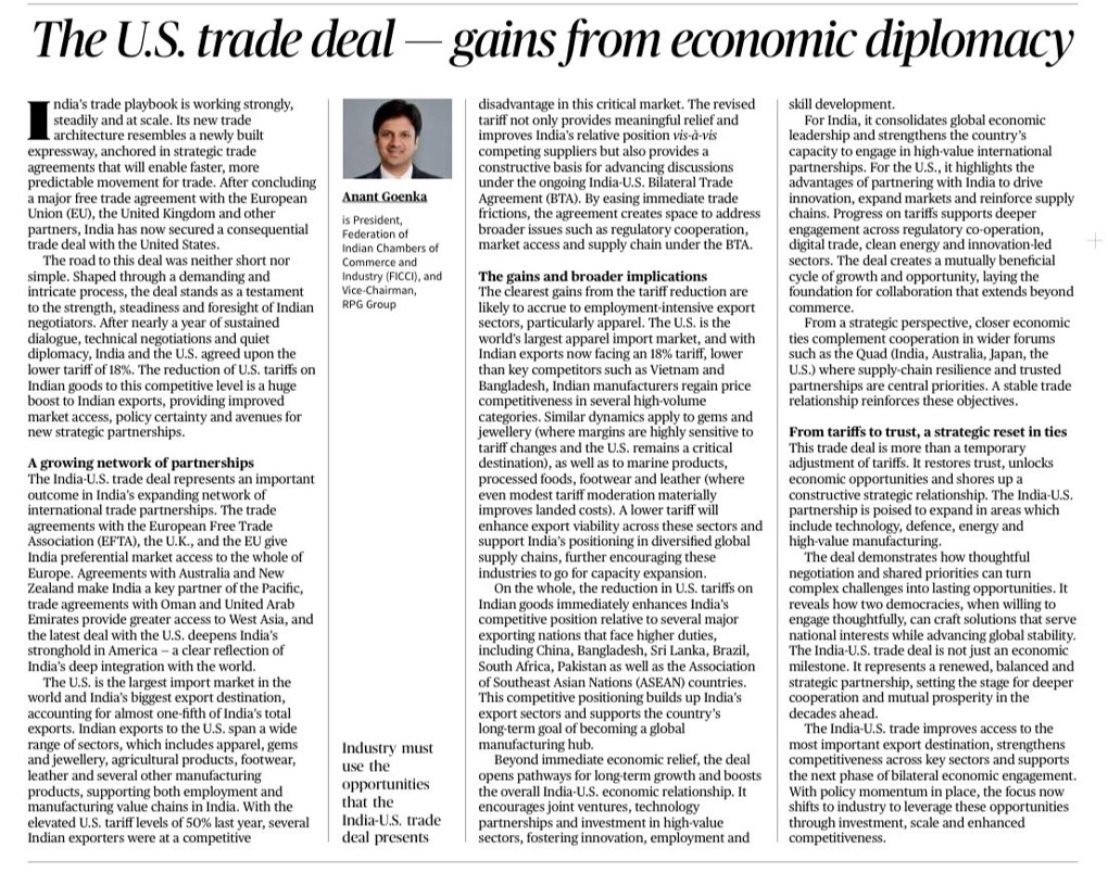 The U.S. trade deal — gains from economic diplomacySyllabus: GS 2: International Relations – India–U.S. relations, economic diplomacy
