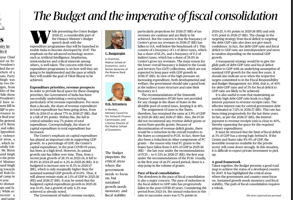 The article critically examines the Union Budget 2026–27 with a focus on fiscal consolidation, analysing whether the current expenditure priorities, revenue assumptions, and deficit targets are sustainable while pursuing the long-term goal of making India a developed country by 2047.