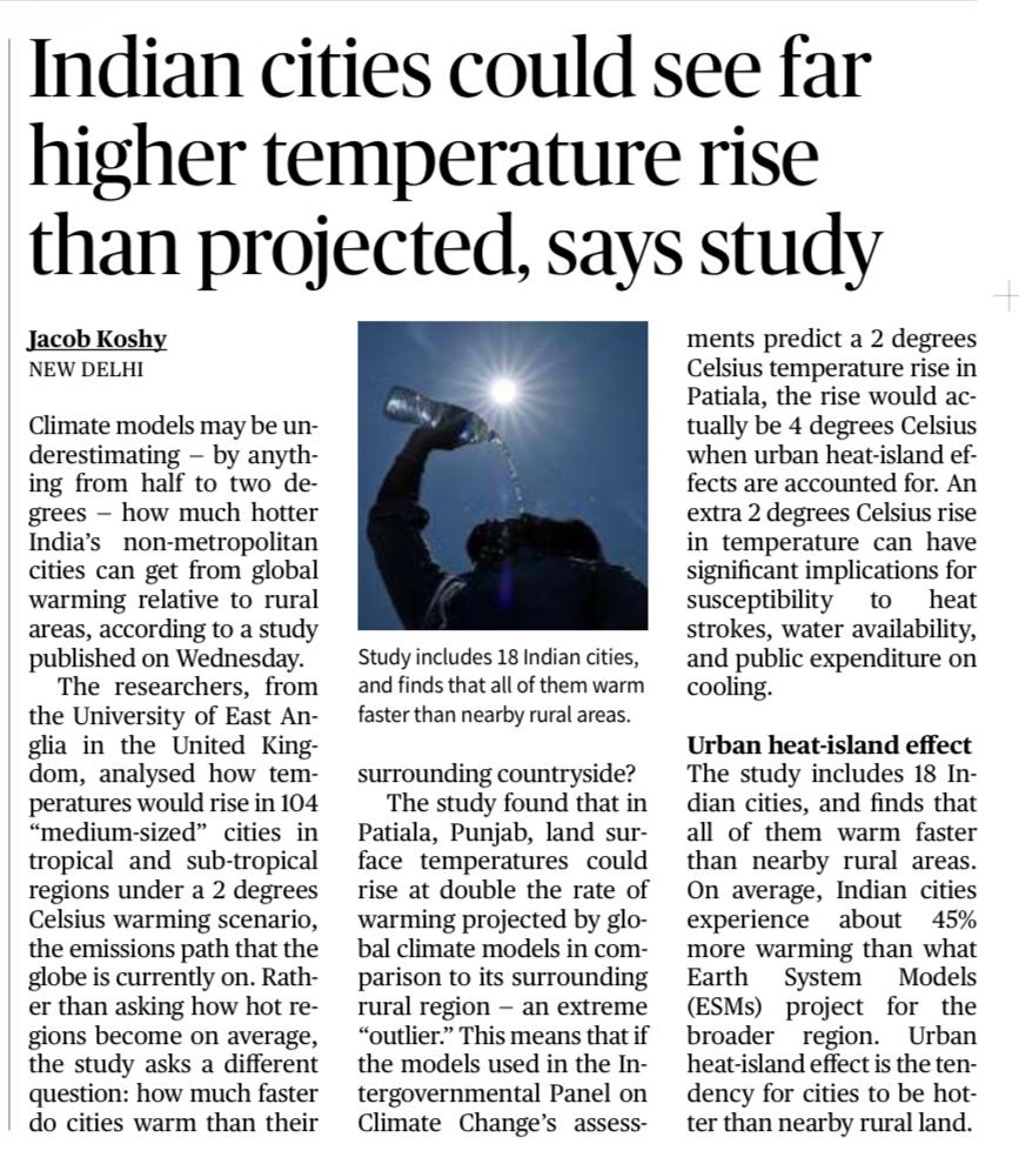 The news is based on a recent scientific study which warns that Indian cities may heat up much faster than projected by global climate models, mainly due to the urban heat-island effect, increasing climate risks for urban populations.