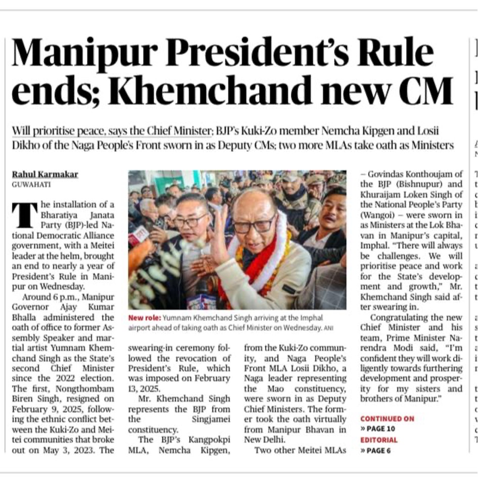 The news is in focus as President’s Rule in Manipur has been revoked and a new Council of Ministers has been sworn in, ending nearly a year of central rule imposed due to ethnic violence and political instability.