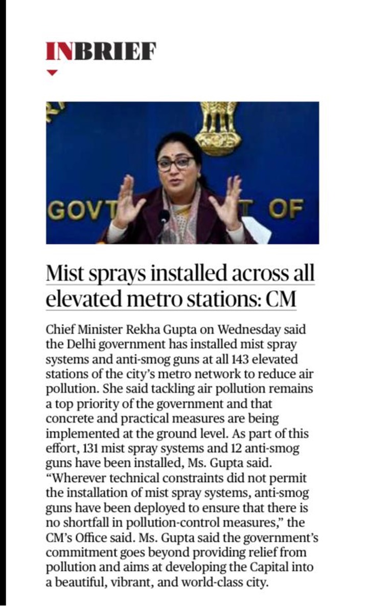 The news is in focus as the Delhi government announced the installation of mist spray systems and anti-smog guns across all elevated metro stations to curb rising air pollution in the city.