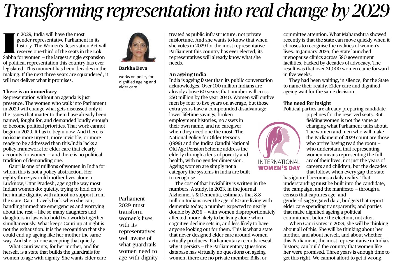 To ensure that the historic increase in women’s representation leads to real improvements in women’s lives, India must prioritise gender-sensitive policies, particularly in areas such as ageing, elder care, and social security. Only then will political representation translate into meaningful and inclusive governance.