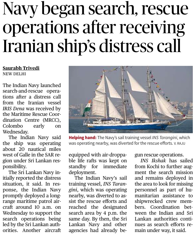 The Indian Navy launched search and rescue (SAR) operations after receiving a distress call from the Iranian vessel IRIS Dena near the coast of Sri Lanka. The operation was conducted in coordination with Sri Lankan maritime authorities, highlighting India’s role as a net security provider in the Indian Ocean Region (IOR).