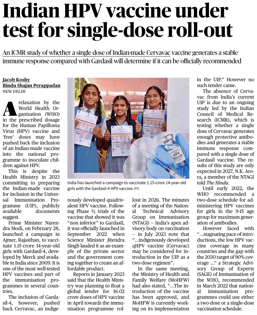 India is examining the possibility of introducing a single-dose Human Papillomavirus (HPV) vaccine in its national immunisation programme. An ongoing Indian Council of Medical Research (ICMR) study is assessing whether a single dose of the indigenously developed Cervavac vaccine can generate a stable immune response comparable to Gardasil, the currently used HPV vaccine. The results of this study will determine whether the vaccine can be incorporated into India’s Universal Immunisation Programme (UIP).About HPV and HPV VaccinesHuman Papillomavirus (HPV)