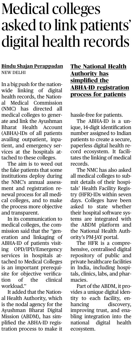 In a major push toward digital healthcare integration, the National Medical Commission (NMC) has directed all medical colleges to generate and link Ayushman Bharat Health Account (ABHA) IDs of patients visiting hospitals attached to medical colleges. This initiative is part of the Ayushman Bharat Digital Mission (ABDM), aimed at creating a nationwide digital health ecosystem.