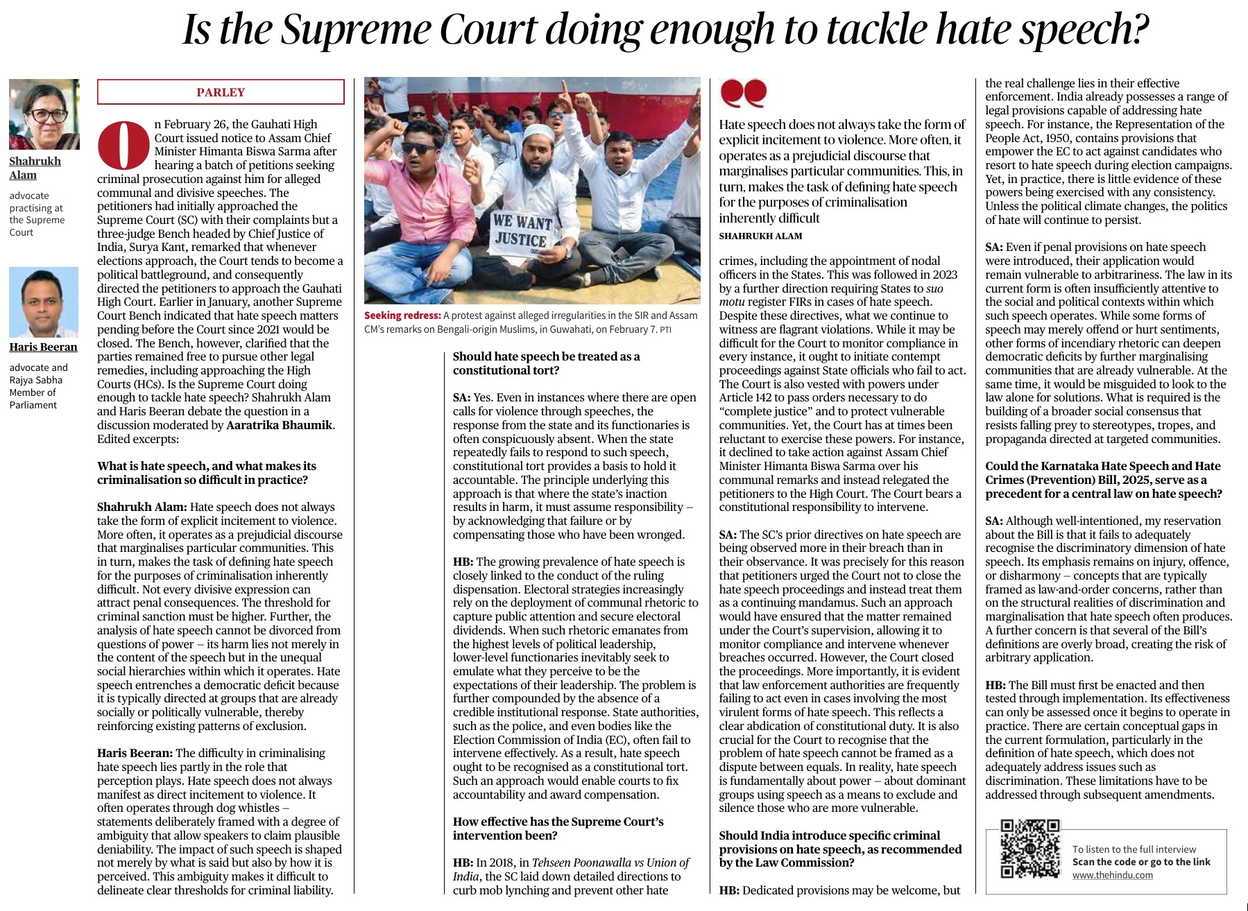The article discusses whether the Supreme Court of India is doing enough to address the growing problem of hate speech, particularly in politically charged environments. The debate was triggered after the Gauhati High Court issued notice to Assam CM Himanta Biswa Sarma over alleged communal remarks, while the Supreme Court asked petitioners to approach the High Court instead of directly seeking its intervention.The discussion between legal experts Shahrukh Alam and Haris Beeran evaluates the effectiveness of judicial interventions and whether stronger legal mechanisms are needed.What is Hate Speech?