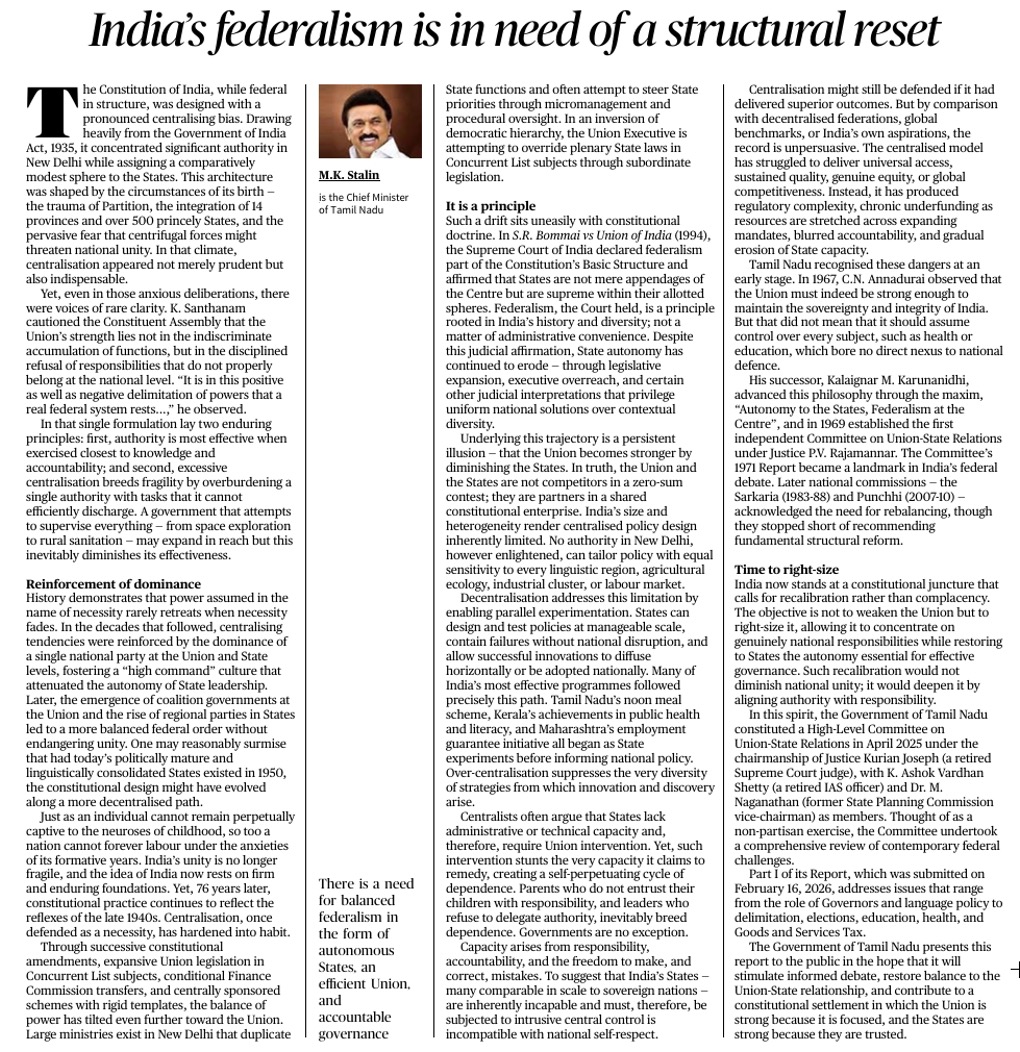 The article discusses the growing centralisation in India’s federal structure and argues that Indian federalism requires a structural reset. While the Constitution created a federal polity with a strong Centre (influenced by the Government of India Act, 1935), the author argues that excessive centralisation today undermines state autonomy, innovation, and accountability.