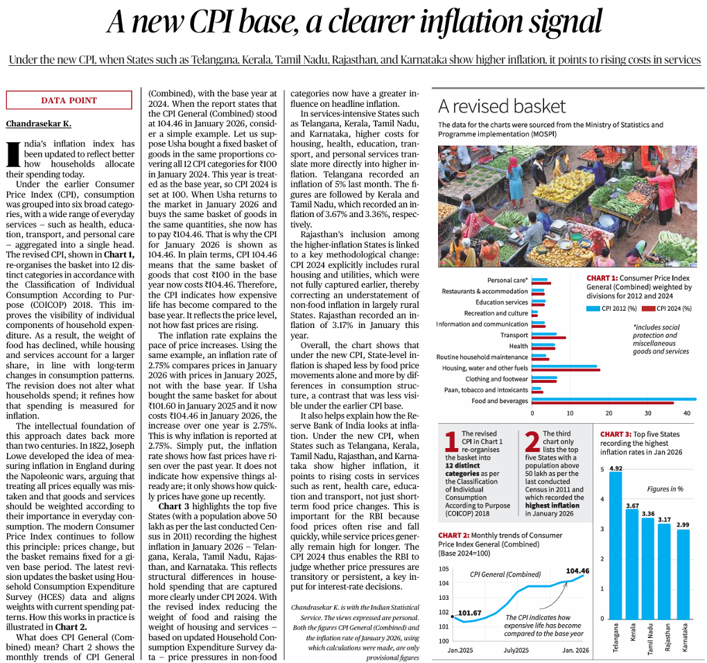 India’s Consumer Price Index (CPI) has been revised with a new base year of 2024. The revised CPI basket reorganises consumption into 12 categories (as per COICOP 2018 classification), updating weights based on recent Household Consumption Expenditure Survey (HCES) data.· The revision aims to better reflect present-day consumption patterns and provide a clearer signal on inflation trends.