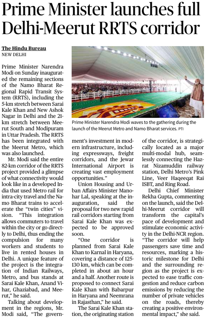 The Prime Minister inaugurated the remaining sections of the Delhi–Meerut Regional Rapid Transit System (RRTS) corridor, completing the 82-km stretch between Delhi and Meerut. The project integrates RRTS with the Meerut Metro and aims to improve regional mobility across the National Capital Region (NCR).Regional Rapid Transit System (RRTS)About RRTS