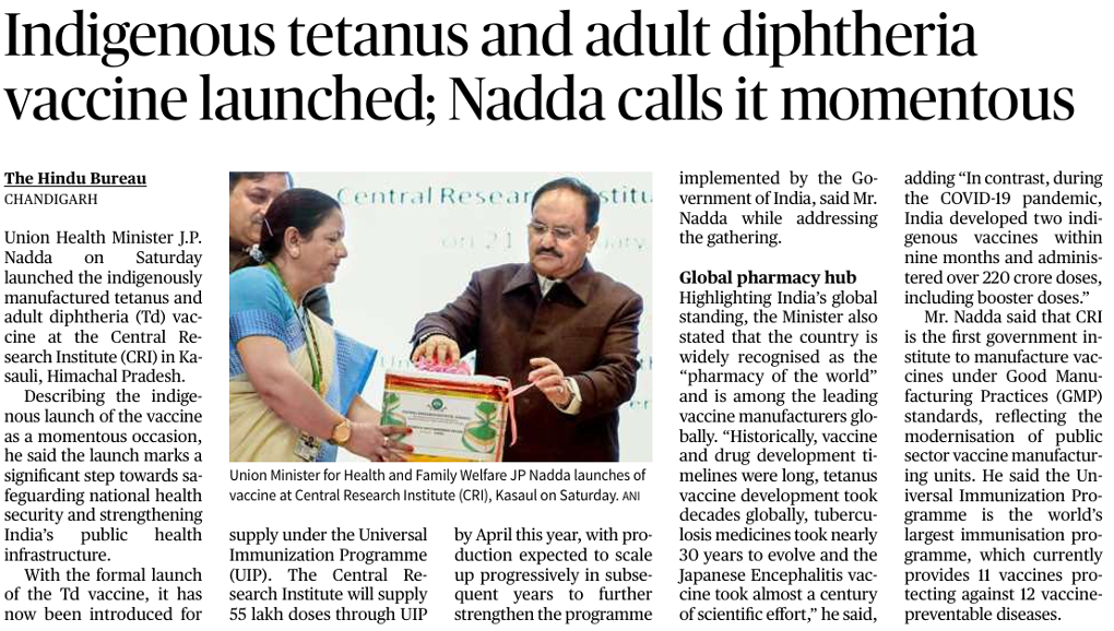 5. Indigenous tetanus and adult diphtheria vaccine launched; Nadda calls it momentous (GS-3)