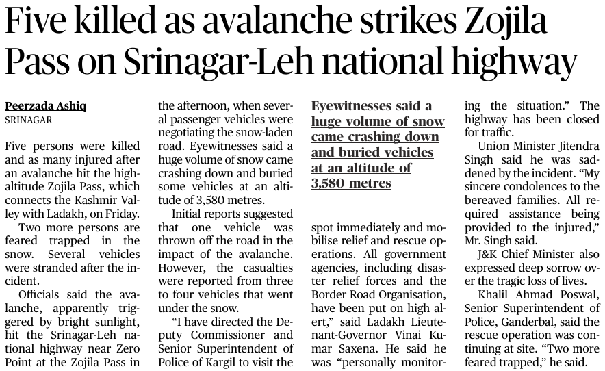 6. Five killed as avalanche strikes Zojila Pass on Srinagar-Leh national highway (GS-3)