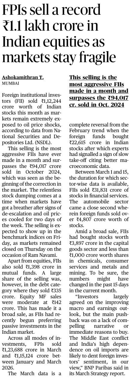 5. FPIs sell a record ₹1.1 lakh crore in Indian equities as markets stay fragile (GS-3)