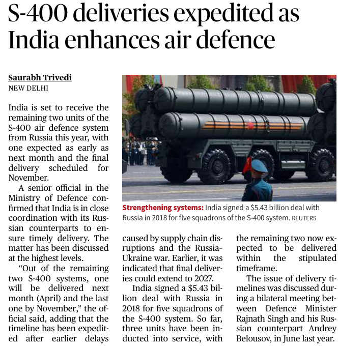 4. S-400 deliveries expedited as India enhances air defence