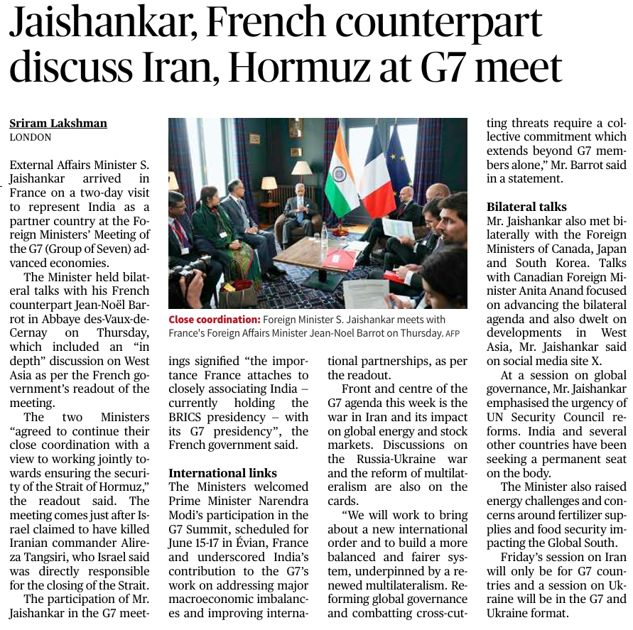 3. Jaishankar, French counterpart discuss Iran, Hormuz at G7 meet (GGS-2)